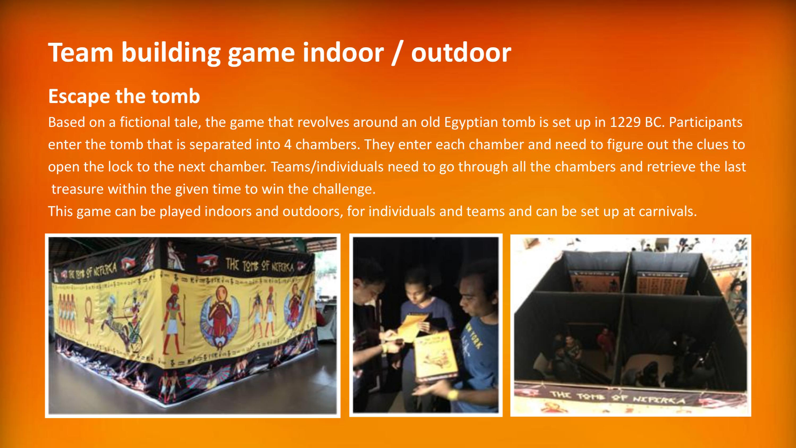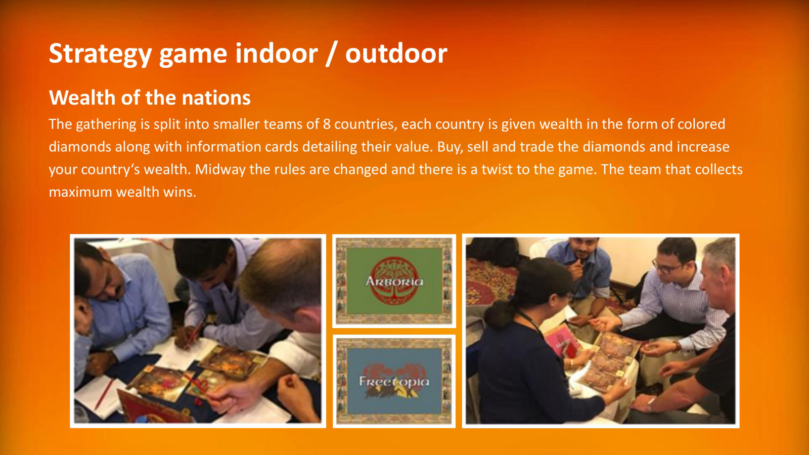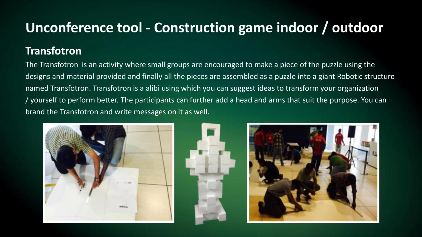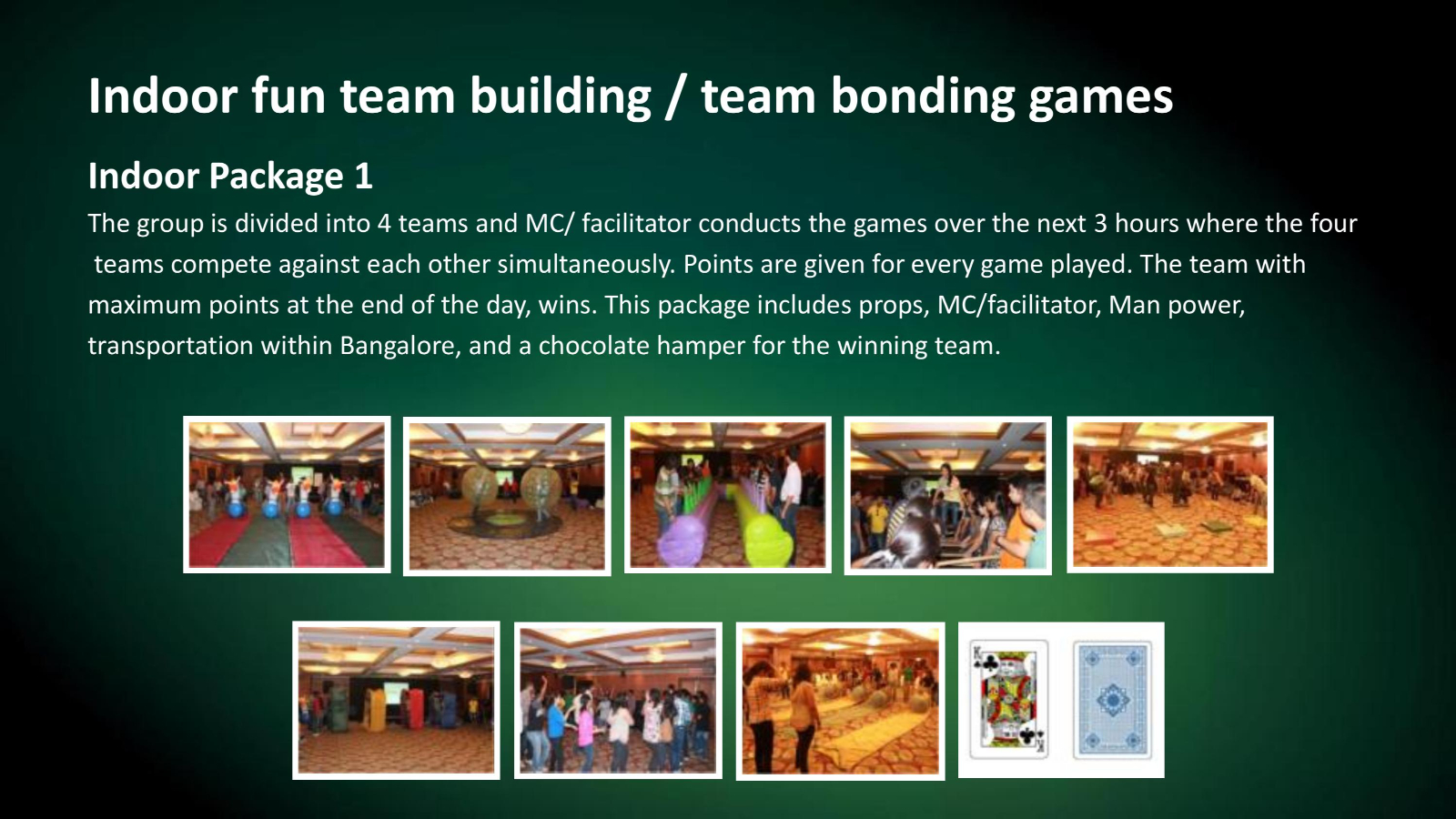 We have team building games which are designed to be played indoors for conferences as ice breakers. We have fun team building games that are large, colourful and can be played indoors.